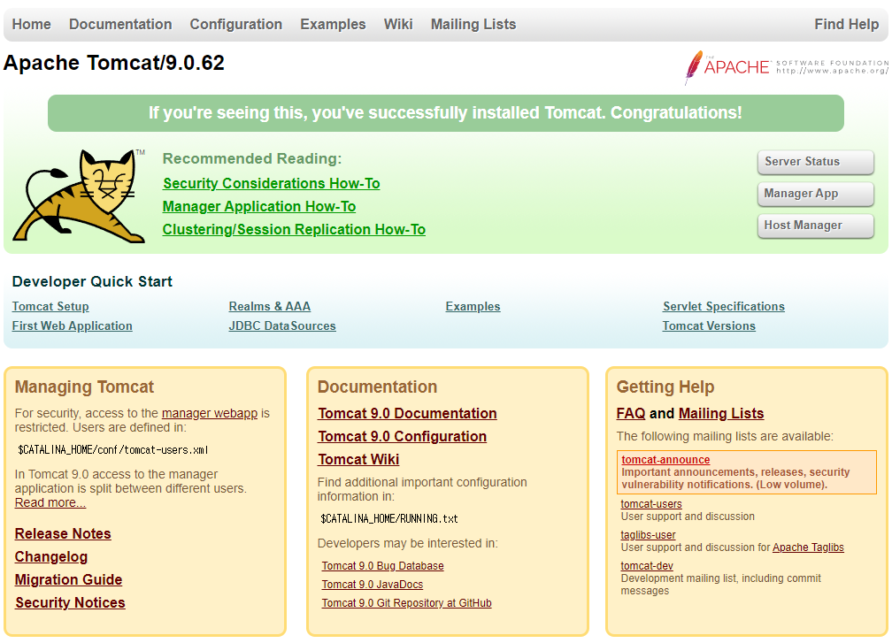 Core > zip 다운로드 > C:\ 압축 해제 > C:\apache-tomcat-9.0.62\bin\startup.bat > 톰캣 페이지 접속