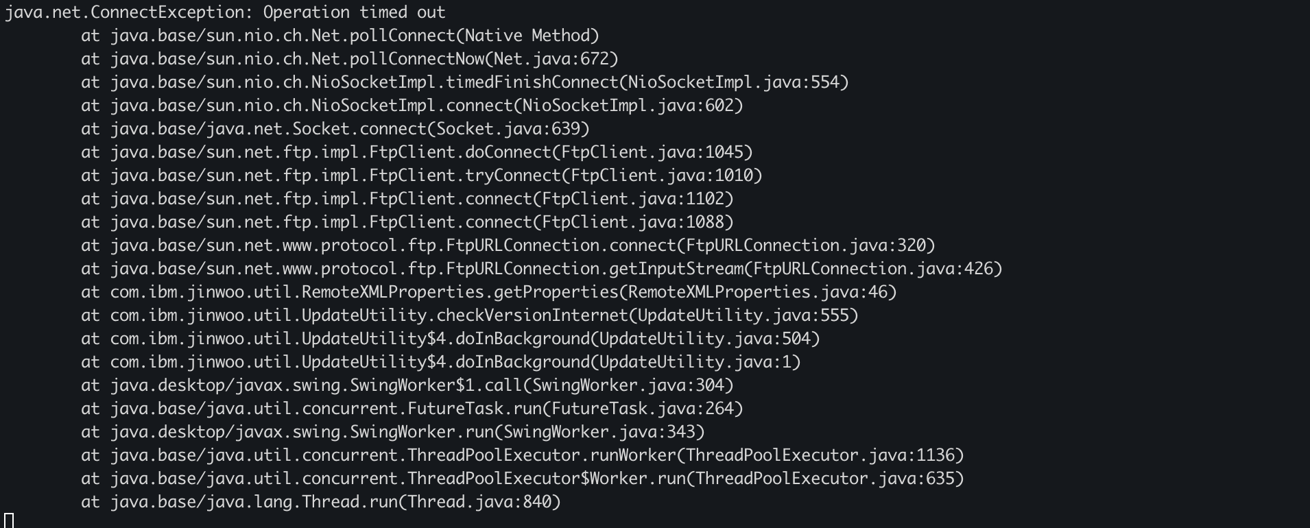 IBM HeapAnalyzer 를 실행 하면 ftp 연결을 시도하는데 timeout 발생한 에러 이다. (신경쓰지 않아도 되는 에러이다.)