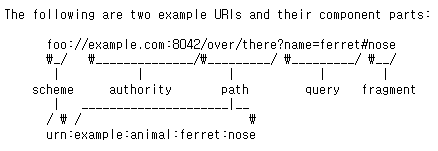 : 일반 URI와 절대 URI 참조 문법은 RFC 2396에 처음 정의(1998년 8월 출판), RFC 3986로 완성(2005년 1월 출판)